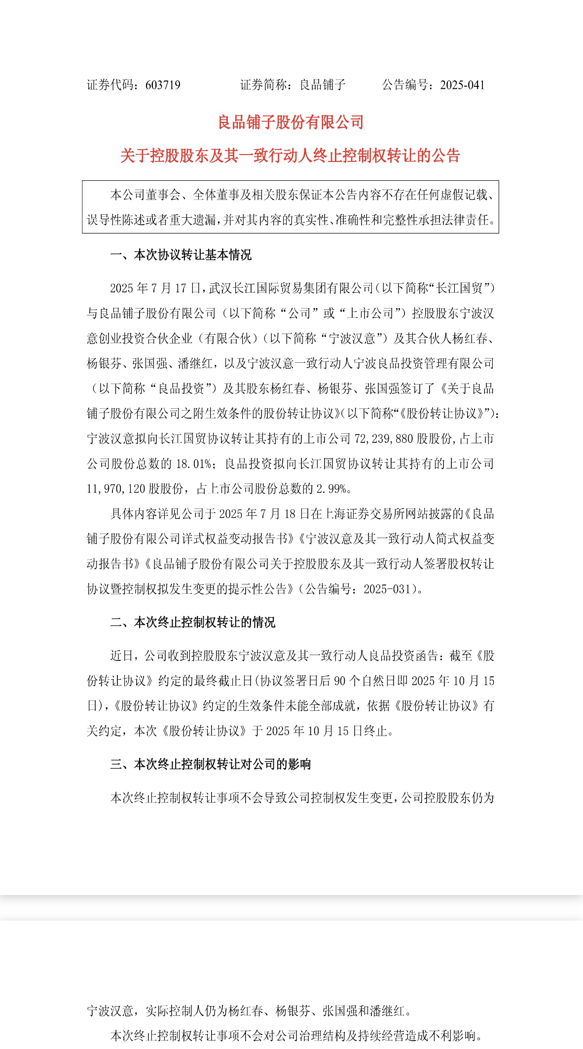 海报新闻记者 刘静一报道 10月16日晚,良品铺子公告称,公司大股东宁波汉易创业投资合伙企业及其关联公司良品铺子投资与武汉长江国际贸易集团有限公司之间的《股权转让协议》于10月15日终止。公告称,终止原因是合同生效的各项条件均未达成。 遇见了。这也意味着良品铺子三个月的控制权交接正式落空。按照原计划,交易完成后,武汉市国资委将成为Vestore的实际管理人。公司强调,终止本次控制权转移并不实际改变公司控制权,不会对公司治理结构或公司持续经营产生不利影响。 10月17日下午,海报新闻记者(微信ID:HaibaoNewsSw)多次致电良品铺子董事会秘书办公室询问解聘事宜,但无人接听。良品铺子 图片来源视觉中国海报新闻记者发现,这场控制权转让之争始于今年7月。良品铺子大股东宁波汉亿拟将其18.01%股权转让给武汉长江国贸集团有限公司(以下简称“阳江国贸”),良品铺子拟转让其2.99%股权。交易完成后,长江国际贸易将持有贝斯塔21%的股份,成为新的大股东。公开资料显示,长江国贸由武汉金融控股(集团)有限公司100%控股,而武汉金融控股(集团)有限公司现由武汉市国资委100%控股。武汉市人民政府.该协议从一开始就备受争议。今年5月,宁波汉益与广州轻工贸易集团就股权转让问题进行了谈判,并签署了《协议》以解决其债务。根据协议,广州轻工拥有5月28日之前股份交易的优先购买权。但宁波汉益及其共同方并未在约定期限内与广州轻工签署相应的股份交易协议。由此,广州轻工提起诉讼,要求财产保全,并冻结了宁波汉益持有的贝斯塔19.89%的股份。据此前报道,10月17日,亚商店官方回应称:“作为一家上市公司,我们的首要任务是聚焦核心业务,做好运营。目前,公司各项业务运行平稳,我们将继续做好日常经营管理,努力做好各项业务。”良品铺子股权变更是由于公司近年来财务状况不太乐观。2025年上半年,良品铺子营业利润为282.9万元,同比下降27.21%。归属于上市公司股东的净利润为-9355.31万元,同比下降491.59%年。 公司解释称,销售额下降的主要原因是产品优化调整、部分产品降价、门店结构优化以及主动关店等。效率低下。截至10月17日收盘,良品铺子股价为12.38元/股,跌幅为2.83%。
