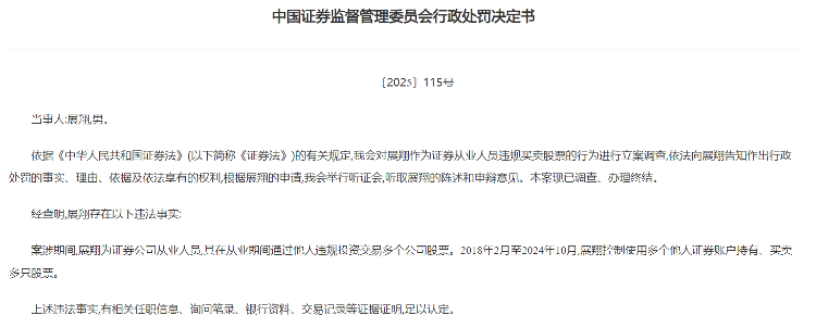海报新闻周凌峰报道,证监会近期连续四次发布行政处罚决定,均涉及证券从业人员违规炒股行为。罚款、没收的最高限额为1.59亿元。据证监会介绍,被罚款的四人是事发时该券商的员工。 2018年2月至2024年10月,张先生管理利用他人经纪账户持有、交易多只股票。最终,证监会责令张先生依法对违规持有的股票进行处理,并责令其缴纳罚款、没收人民币共计1.59亿元。 2008年3月至2024年10月,金木平利用他人证券账户非法持有、交易多只股票。最终,证监会决定没收金武平先生的股权。违法所得500.5万元,并处罚款500.5万元。 2016年5月,邓木安通过他人买卖关联公司股票。最终,证监会责令邓木安对非法持有股票依法进行处理,没收违法所得17.5万元,并处罚款35万元。 2016年5月至2023年11月期间,赵慕强先生通过他人买卖关联公司股票。最终,证监会责令赵木强对非法持有股份依法进行处理,没收违法所得7万元,并决定处以25.67万元罚款。记者发现两起重大事件尤其值得注意。首先,张先生因非法股票交易被中国证监会罚款1.59亿元,并被禁止进入股票市场五年。这不仅是有史以来对类似人处以的最高罚款这起事件不仅在监管年度内发生,而且还创下了近年来单次事件最高罚款记录。二是民生证券就业保险代理人穆平被罚款1000万元以上。他“上任后立即开始炒股”,并在2017年和2016年全年从事非法股票交易,跨越新旧证券法颁布期间。近年来的“问题保险代理人”中,他是唯一因个人证券交易活动受到严厉处罚的人。事实上,禁止员工持股一直是证券行业不可避免的红线。 《证券法》明确规定:证券交易所、证券公司、证券登记结算机构的工作人员、证券监督管理机构的工作人员以及法律、行政法规禁止从事的其他人员从事股票交易的人员在任职期间或者法定期限内不得直接或者以虚假名义或者名义持有、买卖股票或者其他形式的证券。您也不得接受他人赠送的股票或其他股票类型证券。然而,类似的违规行为时有发生。近年来,监管部门不断严厉打击证券公司非法股票交易行为。据证监会此前披露的数据,2019年至2023年五年间,证监会共查处员工违法股票交易案件67起,对139人给予行政处分。从现有判例来看,参与非法股票交易的当事人,多数情况下会被依法责令处分其所持有的股票(如果仍持有),没收违法所得,并处以罚款。我近年来,不少入境禁令案件涉及严重违法、涉案和长期管制。例如,招商证券原首席执行官熊振涛因非法买卖股票26年被罚款6713.2万元,并采取永久禁止进入股市的措施。湘财证券原总裁孙永祥利用非公开信息进行谈判,最终被责令依法处理其非法持有的股份。并被罚款1842.29万元,并被禁止证券市场五年。相比之下,张先生没收的数额“更可观”。根据行政处罚决定书,张先生还提交了答辩意见,认为关联账户交易的实质是代表他人账户买卖股票,所涉及的投资并非其本人的决定或资金,且其行为属于代他人账户买卖股票的行为。其所属证券账户与本案无关,请求减轻处罚。但证监会经审议后表示,记录的证据足以证明詹某控制、使用相关证券账户并作出交易决策,相应资金由詹某控制、使用,足以认定詹某存在非法持有、非法买卖股票等违法行为。而且,对于此事,事实上,考虑到性质、情节和社会影响,处罚是适当的。总之,辩方的相关说法和论点不予采纳。据证监会2024年执法总结显示,去年证监会开展了严厉打击证券从业人员非法炒股专项行动,对证券从业人员违法违规交易行为进行了严厉打击。采取严厉监管措施,包括对38名证券从业人员给予行政处分,对66名从业人员和7家证券公司发出警告信和监管约谈。共有104名修炼者获得“提名”。