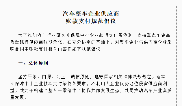 POSPE新闻记者Sunribin在9月15日报告中,中国汽车制造商协会发布了“关于支付完整汽车汽车公司供应商的倡议”(以下简称“倡议”)。为“车辆集成部分”建立共同开发和收益的生态系统。 9月15日,中国汽车和汽车公司协会发出了“向全套汽车公司的供应商付款”。 “倡议”的一般原则不是利用大公司的主导地位来违反供应商的利益,而是创建一个对“综合车辆”都有益并促进汽车行业质量发展的开发生态系统。规范要求围绕四个重要链接提出:确认订单,交货和承认,付款,清算和合同期。在请求确认过程中,很明显要约零件和需求都将决定通过采购订单购买商品,并通过交货通知实施要求。在交付和接受过程中,供应商必须按照商定的方式提供货物。作为一般规则,汽车公司将在收到本文后的三个工作日内完成接受。付款和清算过程指定了帐户期,如果要约的单位价格不同意,则付款方式和处理方法的开始时间。例如,账户期限从B党提供文章之日起不超过60天,并批准按期,稳定和协作的零件接受,并且每份合同有效期超过一年。 “付款标准倡议”的准备声明宣布,该文件规定了汽车公司帐户付款中关键链接的实施要求,请考虑完全考虑他的真正运营条件是汽车公司的实际运营条件,要求广泛提出意见并符合实施条件。此外,中国汽车制造商协会敦促汽车制造商和车辆在其合同中积极包括“付款标准计划”,确保执行付款期承诺并采取实际措施支持工业生态系统的建设。 “企业在供应账户的标准付款计划中,某些汽车制造商的响应屏幕截图。“汽车汽车公司的供应商帐户的标准付款倡议日”,Dongfeng Automobile Group,Ltd. Ltd.,Salis Group Co.,Ltd.,Ltd.,Ltd.,Ltd.党卫军供应商“并建立“获胜的汽车部分”以符合协作和双赢的发展的发展。该行业认为,八家汽车公司对“付款标准化计划”的积极反应将有助于在自动化行业的账户中标准化付款行为,从而使供应商的供应商的范围和质量促进稳定的行业,并促进了该行业的质量,并促进了该行业的质量,并促进了该行业的质量和质量。预计更大的汽车公司的实施是,汽车行业中的双赢开发生态系统“宽阔的车辆”加速。